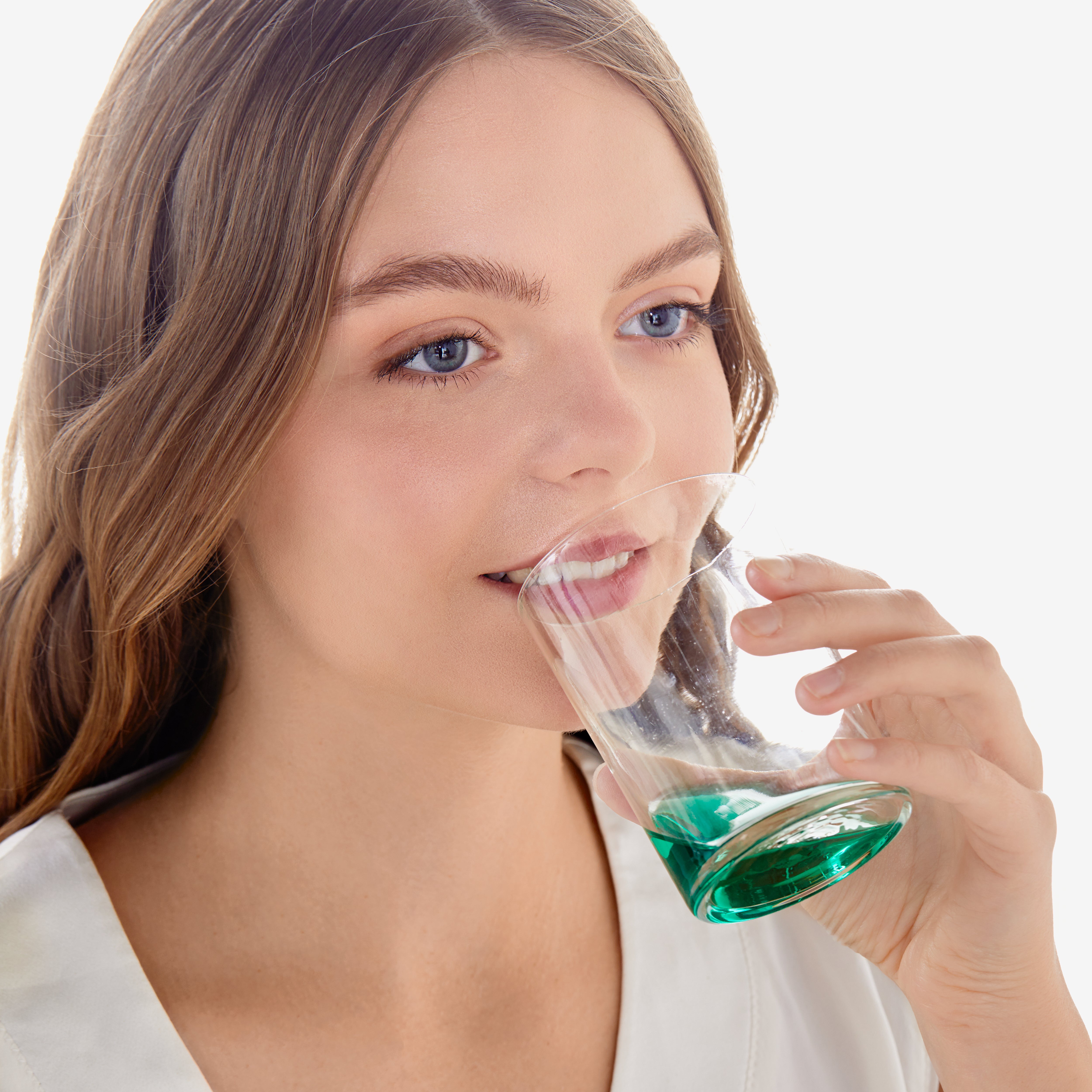 Patient swishes her mouth with Lumorinse for 60 seconds. The light-sensitive colour is designed to adhere to the surface of the plaque and leaves normal flora in the mouth unharmed.